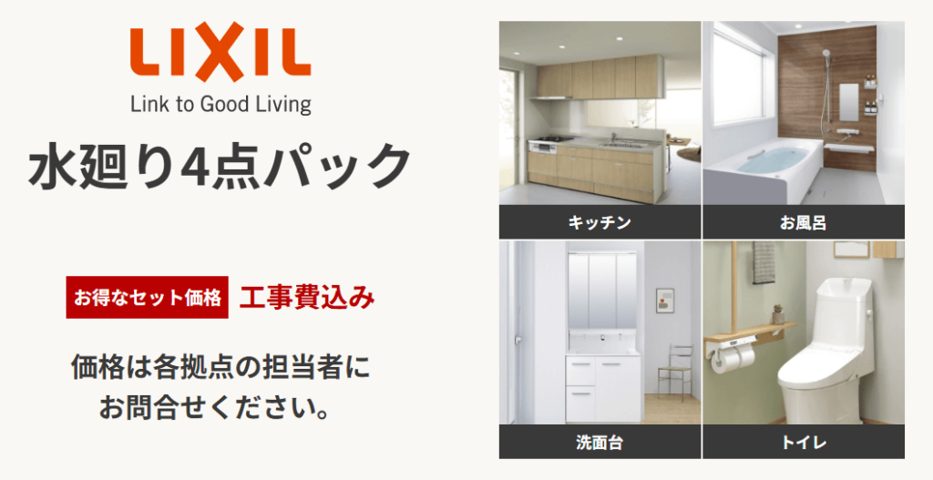 新築そっくりさんでは、まとめて交換することでお得な「水廻り4点パック」を用意しています。