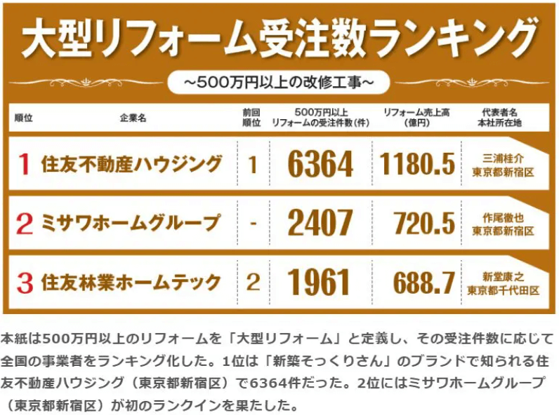 これは、「一棟まるごと再生」させる大規模なスケルトンリフォームを得意としているからで、実際、リフォーム産業新聞の調査では、「500万円以上のリフォーム受注件数ランキング」で1位を獲得しています。
