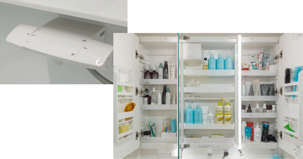 • 洗面ドレッシングは希望していた幅が入らなかったので、お風呂と洗面所の間の壁と浴槽の位置をずらすことで、広いサイズを入れることができています。